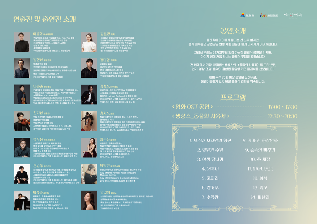 내용 : <겨울왕국 OST>, <스튜디오 지브리 OST> 등 가족 및 어린이 영화 음악들을 클래식 연주로 만나보세요.