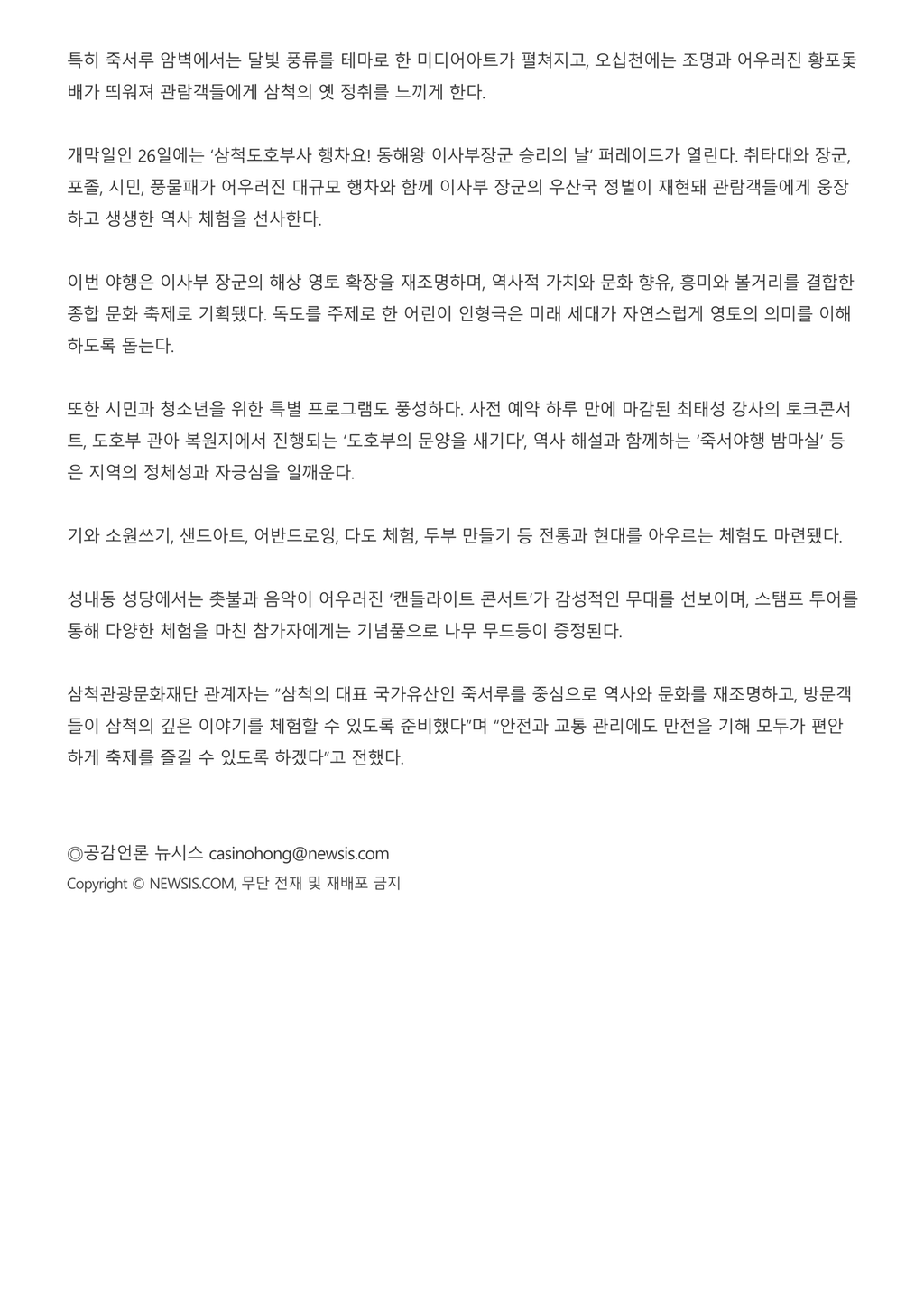 삼척관광문화재단 관계자는 “삼척의 대표 국가유산인 죽서루를 중심으로 역사와 문화를 재조명하고, 방문객들이 삼척의 깊은 이야기를 체험할 수 있도록 준비했다”며 “안전과 교통 관리에도 만전을 기해 모두가 편안하게 축제를 즐길 수 있도록 하겠다”고 전했다.