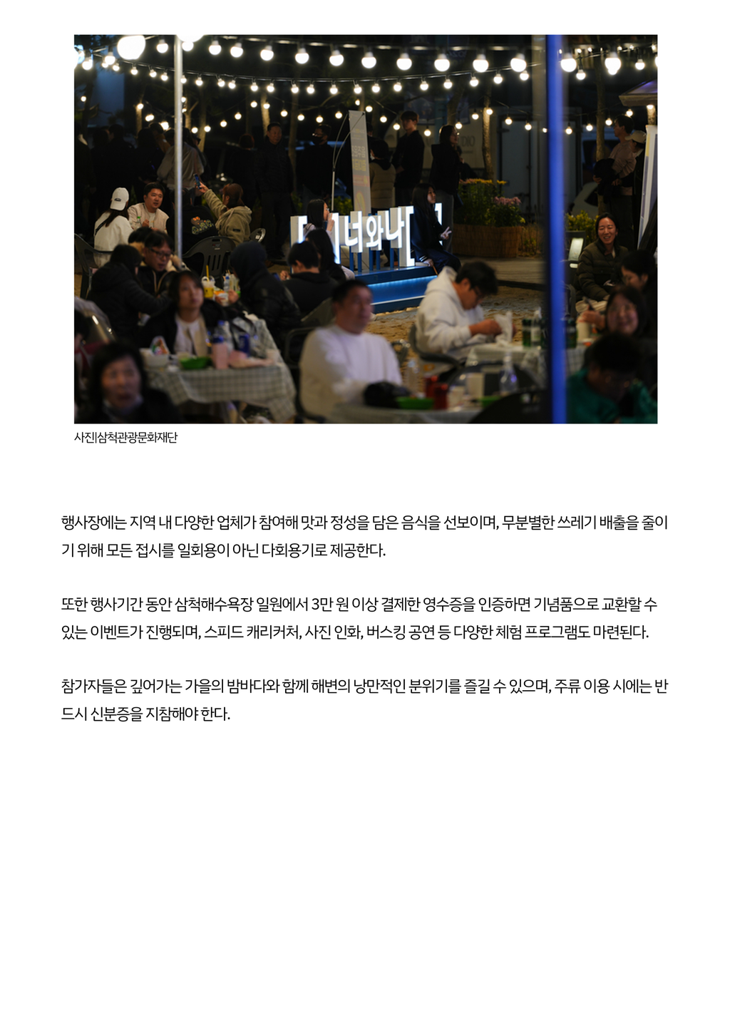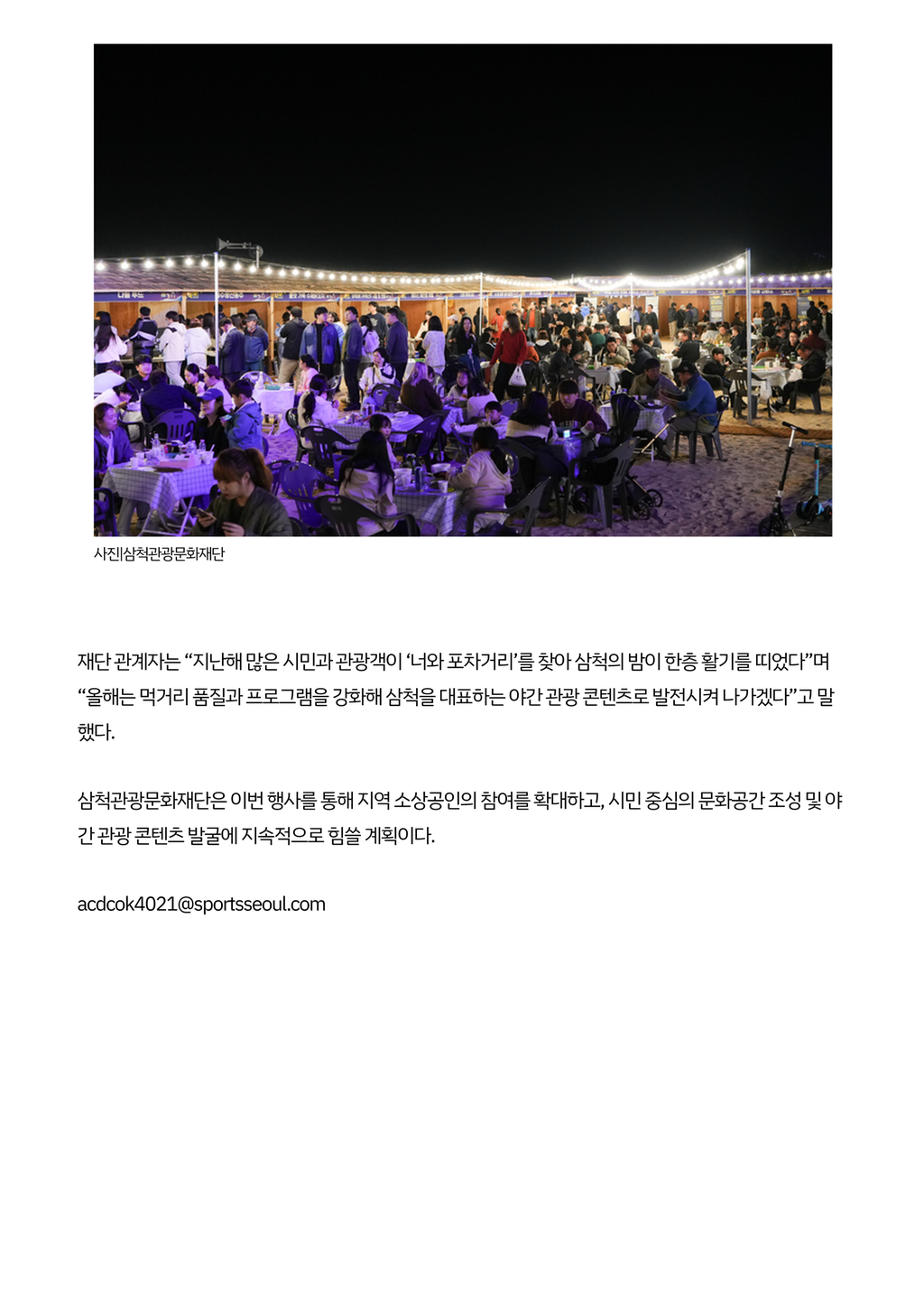 삼척관광문화재단은 이번 행사를 통해 지역 소상공인의 참여를 확대하고, 시민 중심의 문화공간 조성 및 야간 관광 콘텐츠 발굴에 지속적으로 힘쓸 계획이다.