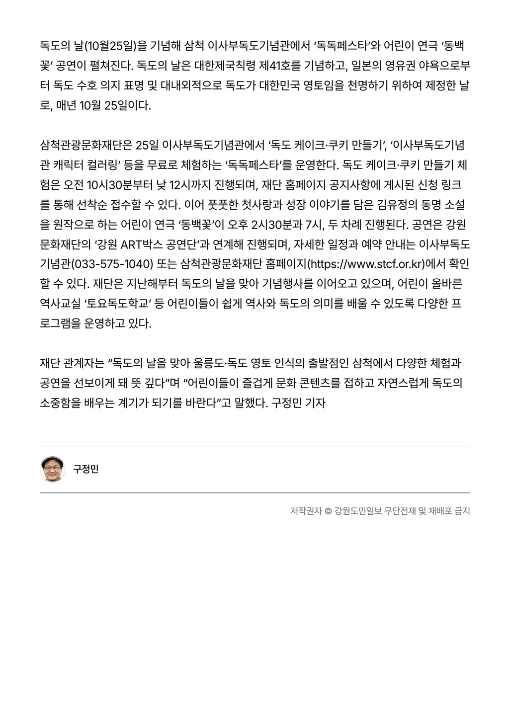 재단 관계자는 “독도의 날을 맞아 울릉도·독도 영토 인식의 출발점인 삼척에서 다양한 체험과 공연을 선보이게 돼 뜻 깊다”며 “어린이들이 즐겁게 문화 콘텐츠를 접하고 자연스럽게 독도의 소중함을 배우는 계기가 되기를 바란다”고 말했다.
