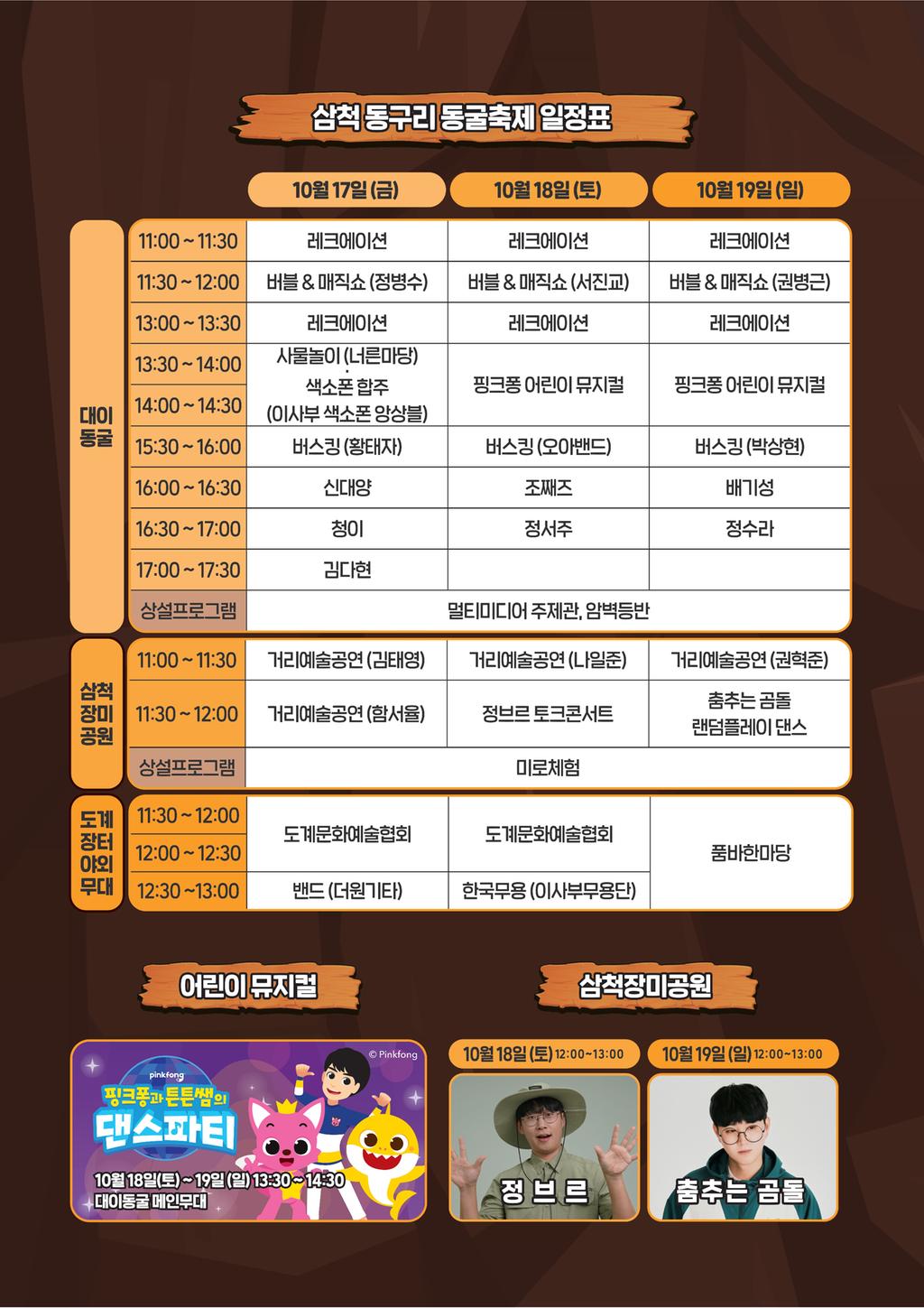 다. 행사내용 : 인기유튜버 공연(정브르, 춤추는 곰돌), 핑크퐁 어린이뮤지컬, 동굴체험 멀티미디어 주제관, 인기가수 축하공연