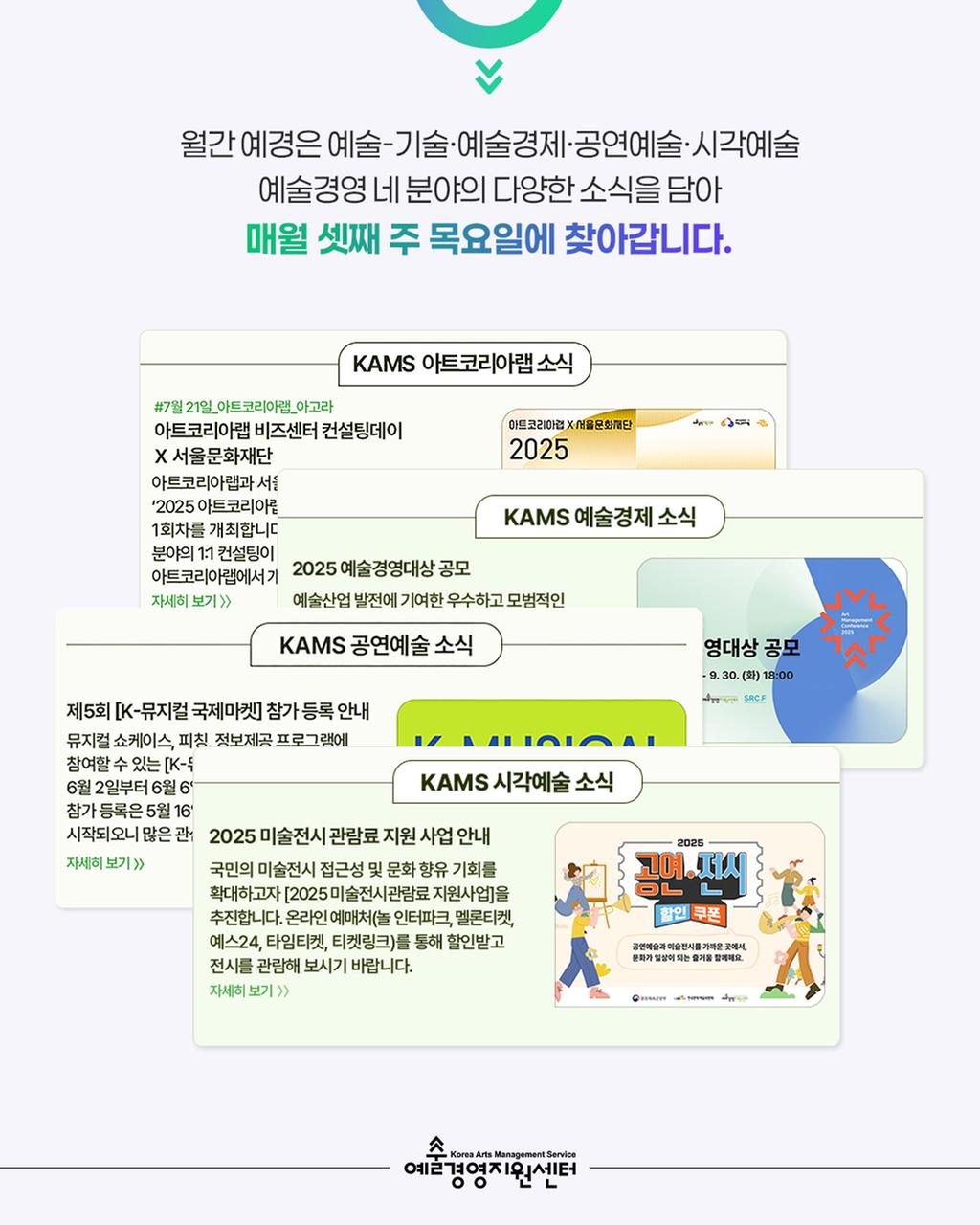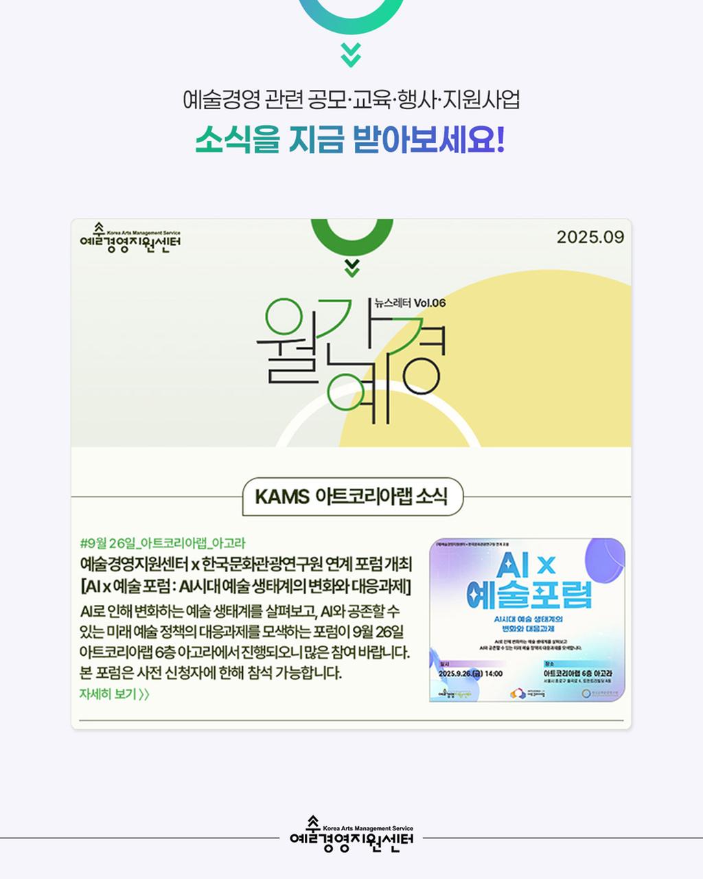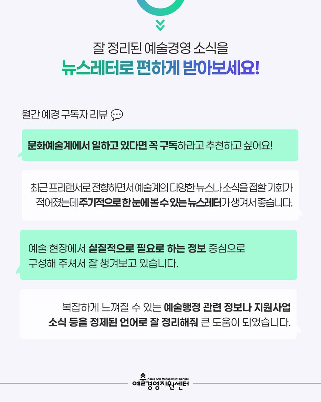 4) 구독방법 : 예술경영지원센터 홈페이지 하단 '뉴스레터 구독신청' 클릭 또는 구독 링크 (https://www.gokams.or.kr/01_news/newsletter_write.aspx)를 통해 신청