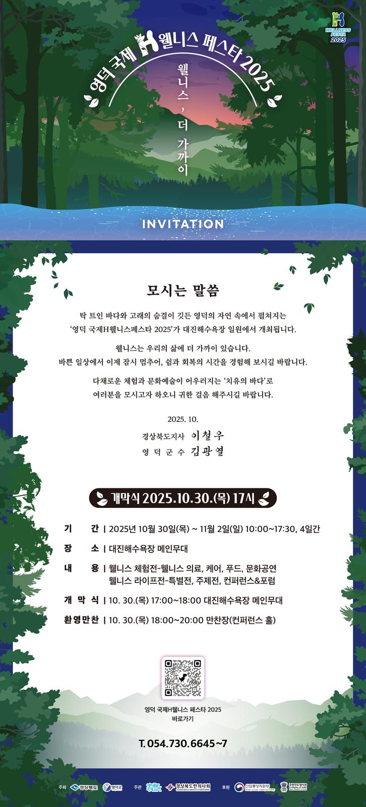 경상북도, 영덕군과 영덕문화관광재단에서는 웰니스 치유관광 콘텐츠 확산을 위해 '영덕 국제H웰니스페스타 2025'를 개최합니다.