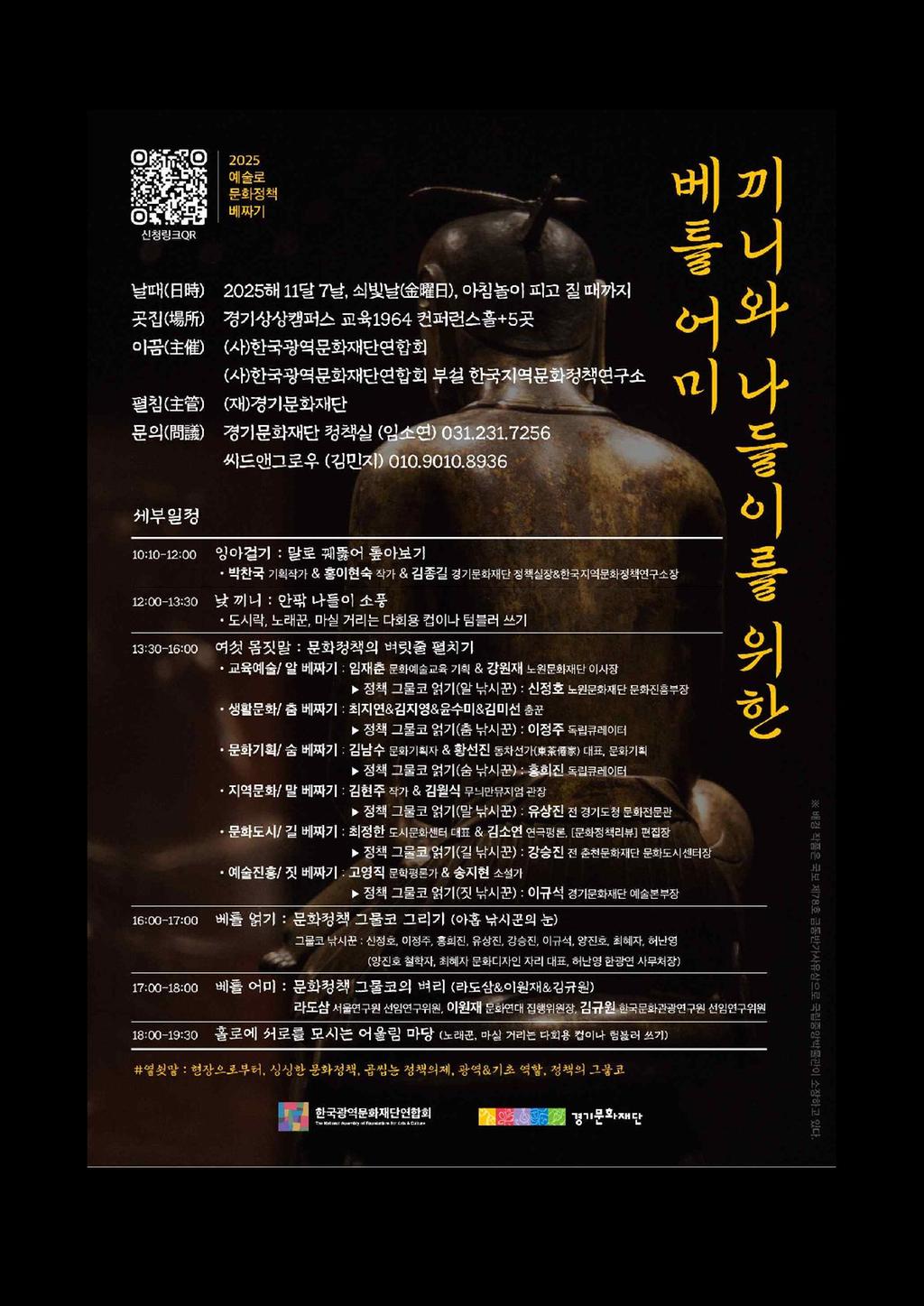 경기문화재단은 2025년 한국광역문화재단연합회 부설 지역문화정책연구소 사무처를 맡아 지속가능한 문화예술 정책 방향을 모색하기 위한 「2025 예술로 문화정책 베짜기」를 다음과 같이 개최하오니, 관계자 여러분의 많은 관심과 참여를 부탁드립니다.