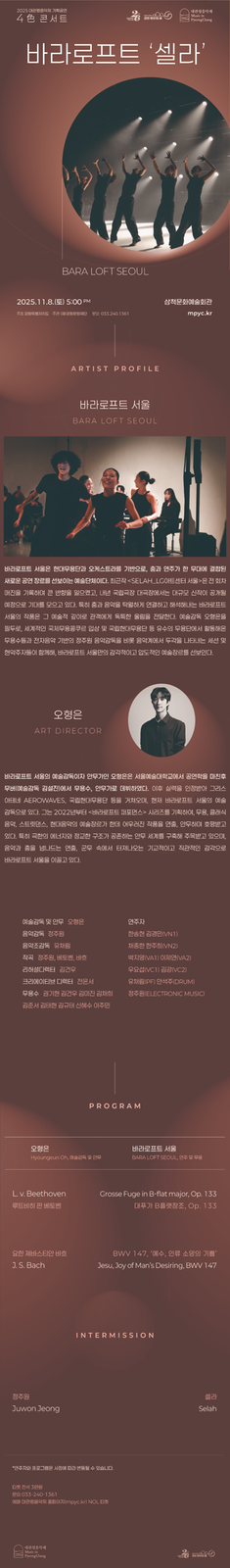 대관령음악제가 진행하는 기획공연 <4色콘서트>'바라로프트-셀라' 공연을 오는 11월 8일 (토) 오후 5시 삼척문화예술회관에서 개최합니다.