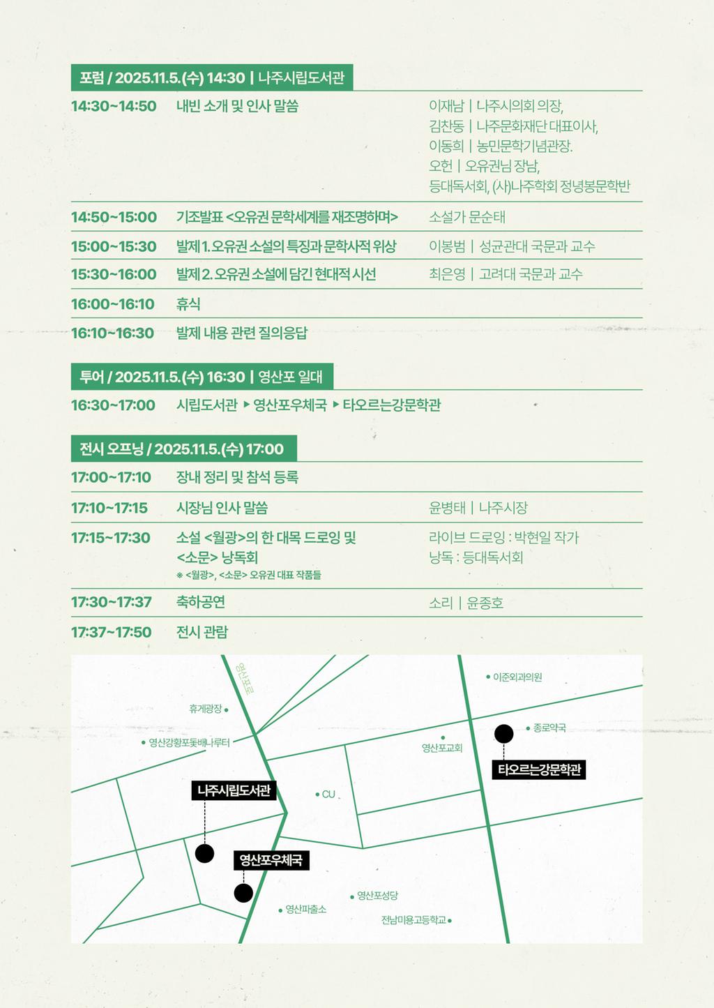 주문화재단은 '2025 지역 문화예술 아카이빙 사업'의 일환으로 나주 출신 소설가 오유권의 삶과 문학세계를 조명하는 「소설가 오유권과 나주의 정체성」포럼 및 전시를 개최합니다.