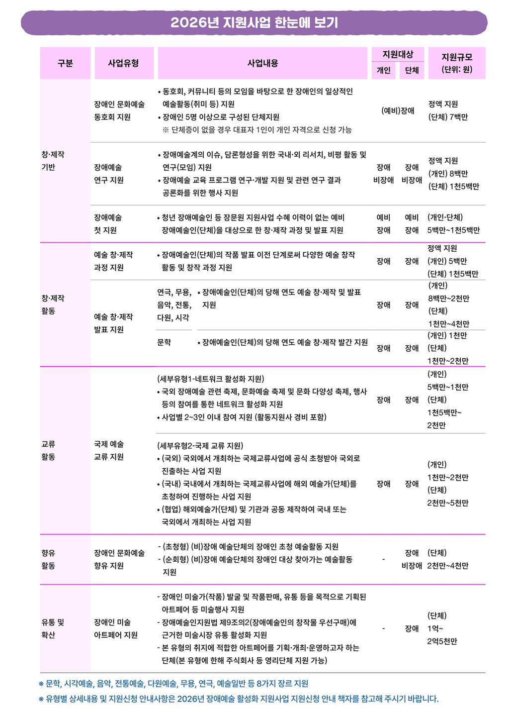 - 세부 사업유형(총 8개) : 장애인 문화예술 동호회 지원, 장애예술 연구 지원, 장애예술 첫 지원, 예술 창·제작 과정 지원, 예술 창·제작 발표 지원, 국제 예술 교류 지원, 장애인 문호예술